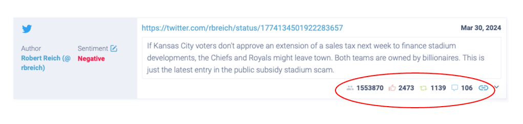 Robert Reich, the Cal-Berkeley Professor, former U.S. Secretary of Labor and outspoken critic of publicly funded stadia, specifically called out Kansas City on two occasions in March, garnering nearly 9,000 likes, comments, or shares from his 1.5 million followers.